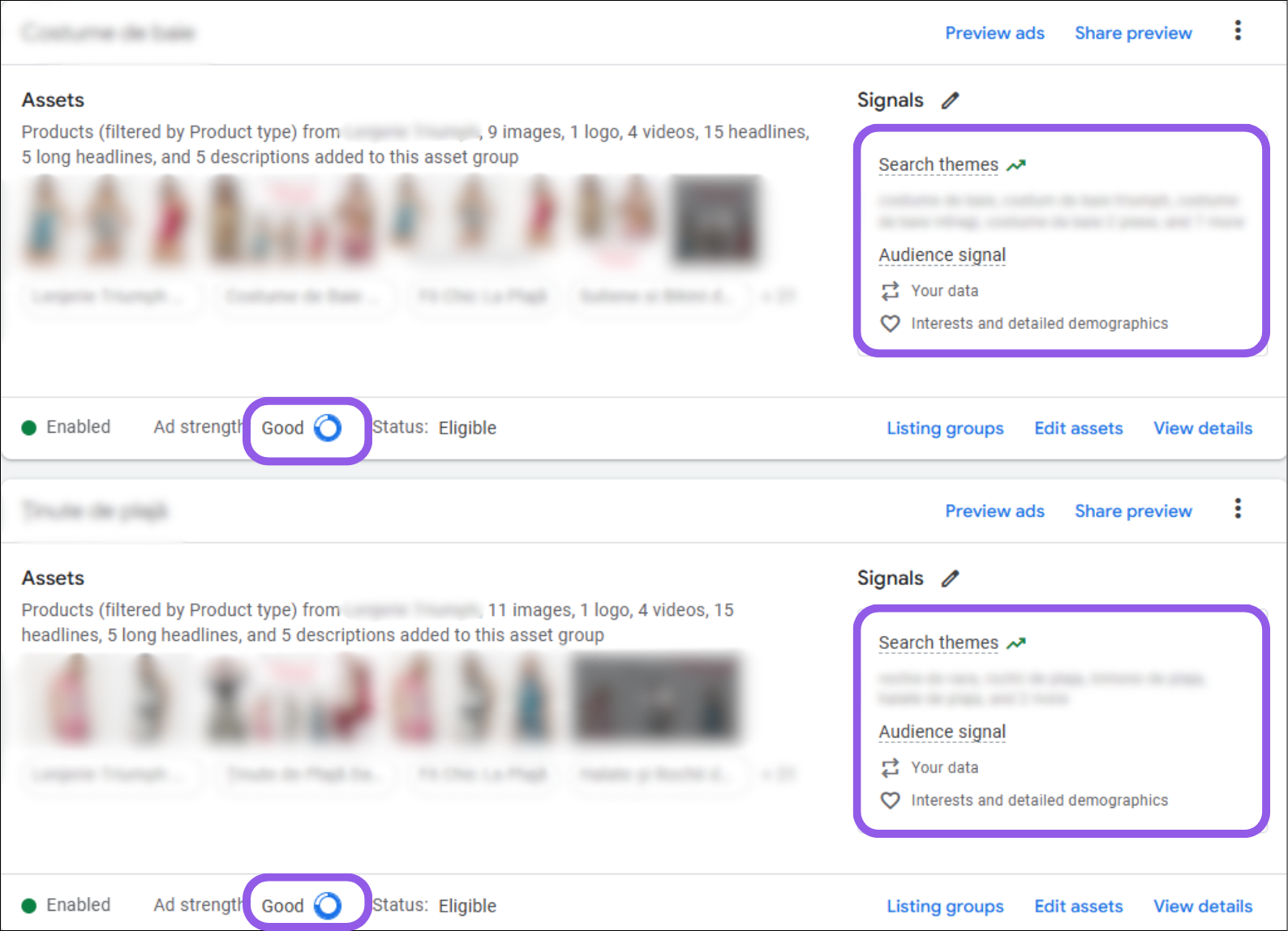 Notă: Din motive ce țin de confidențialitatea contului, am ales să blurăm informațiile cu caracter distinctiv (denumirea campaniilor, textele anunțurilor etc.).