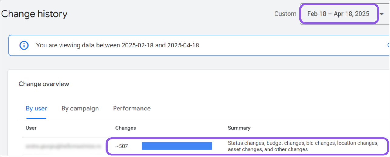 Optimizările și implementările pe care le-am făcut în cont au avut un impact major asupra campaniilor Google Ads (numai în perioada 18 feb. - 18 apr. am realizat 507 optimizări pe cont, vizibile în printscreen-ul de mai jos).