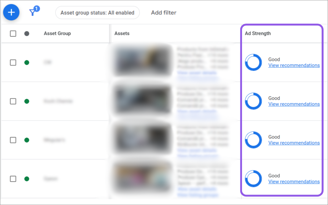 În acest screenshot este scorul anunțurilor din noile campanii PMax, care pe lângă texte (titluri și descrieri) integrează și bannere vizuale + logo